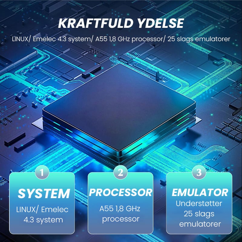 Kraftfuld ydeevne: Udstyret med et robust LINUX/Emelec4.3-system, en kraftfuld A55 1,8 GHz-processor og understøttelse af 25 typer emulatorer. Det sikrer M25 retro-spillekonsollens problemfrie gameplay, selv i de mest krævende retro-titler.